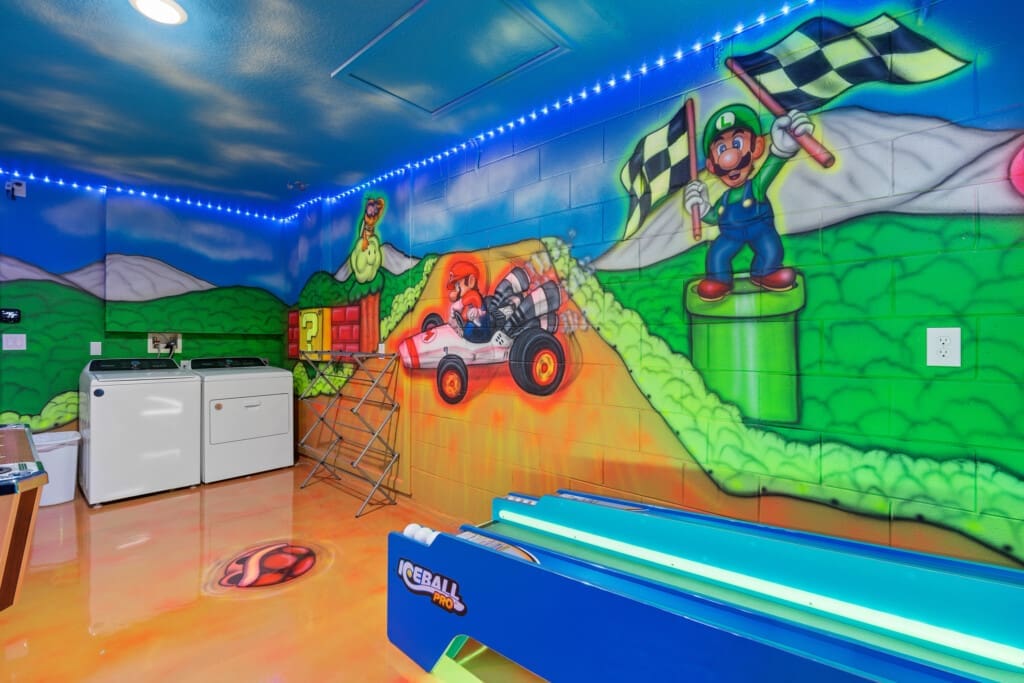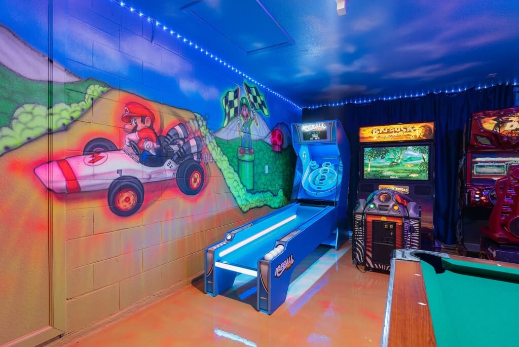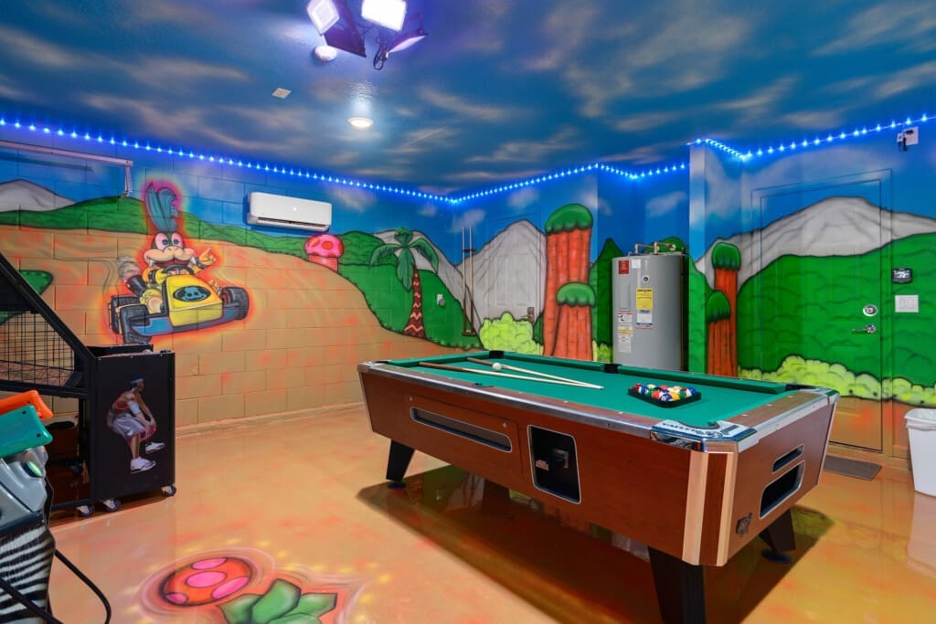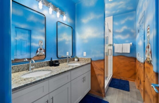 Ignite their imagination at Chillax Inn Beechfield! This 5-bedroom, 5-bath home offers a fully themed experience with a private south-facing pool and complimentary in-home arcade. Just minutes from Disney World, it’s perfect for families seeking fun and relaxation. Enjoy Windsor Hills Resort amenities including pools, tennis, and more. Pool heat and grill rentals available, plus a fun in-home scavenger hunt you won’t find in typical rentals.
