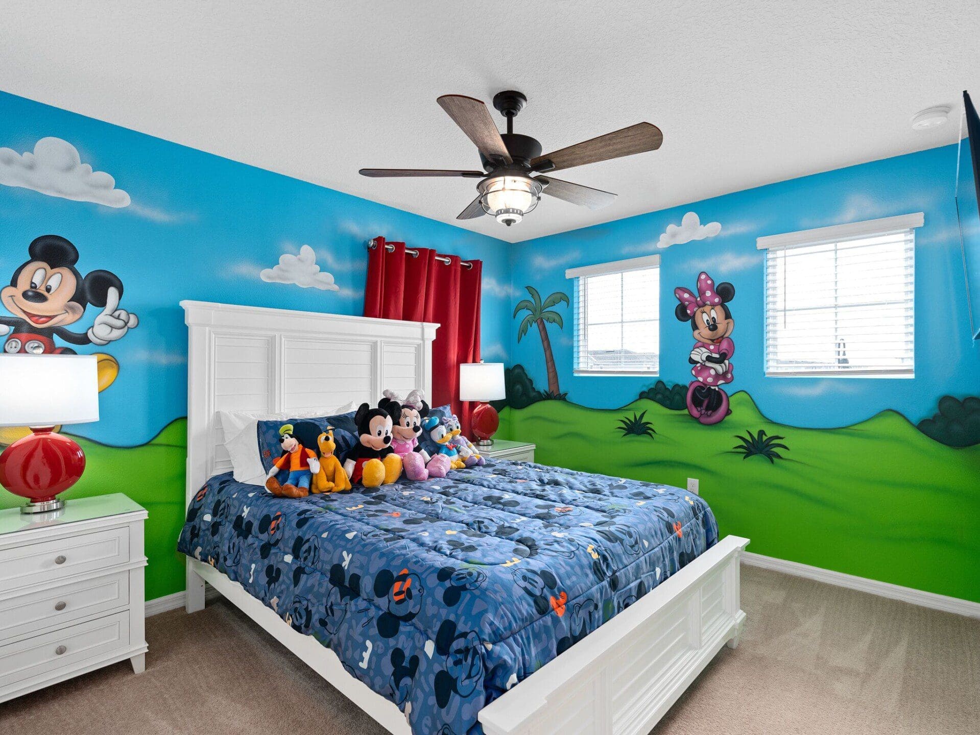 A cozy Mickey Mouse-themed bedroom offering a fun family stay close to the Top Things to Do Near Windsor Island